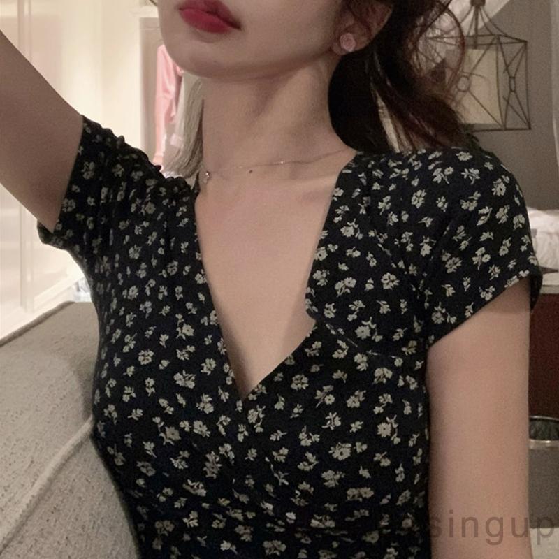 Áo ôm dáng cổ chữ V tay ngắn in họa tiết hoa thanh lịch thời trang mùa hè cho nữ