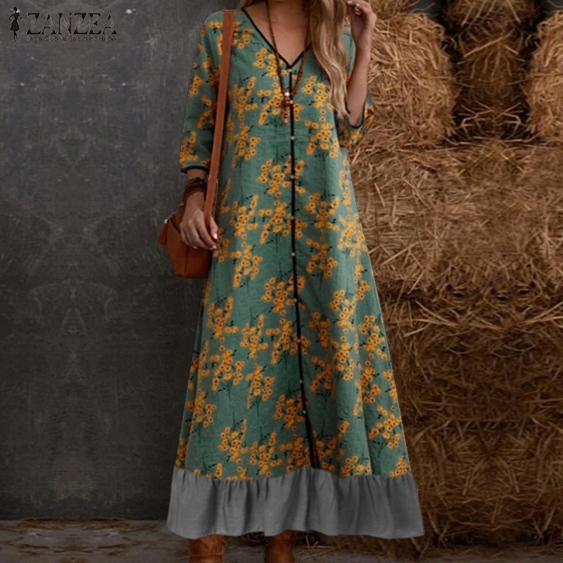 Áo đầm ZANZEA dành cho nữ thiết kế tay dài 3/4 xòe rộng in hình hoa phong cách cơ bản cổ điển