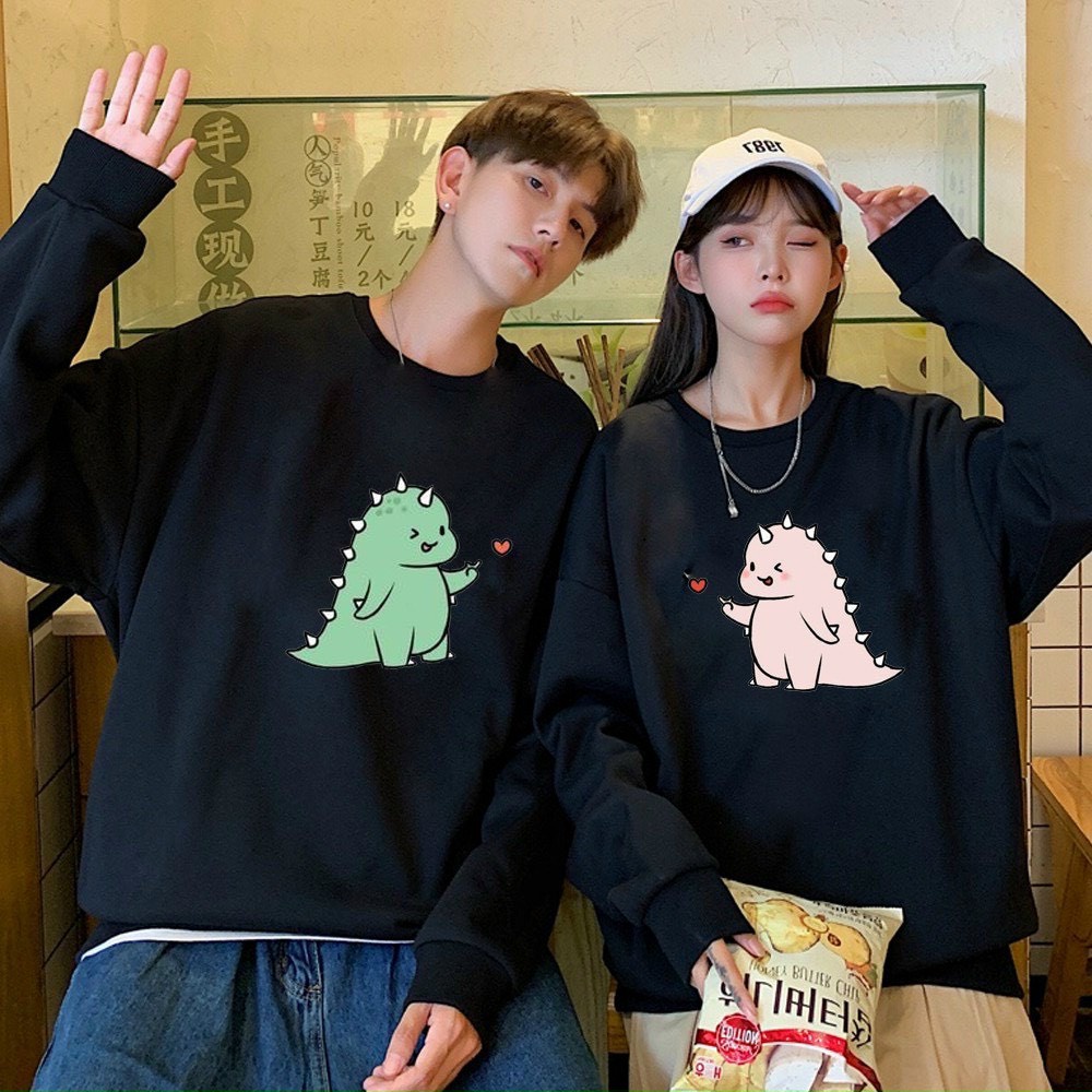 Áo Cặp Đôi Nam Nữ Nỉ Bông Không Mũ Cổ Tròn In Hình Khủng Long Chất Vải Mịn