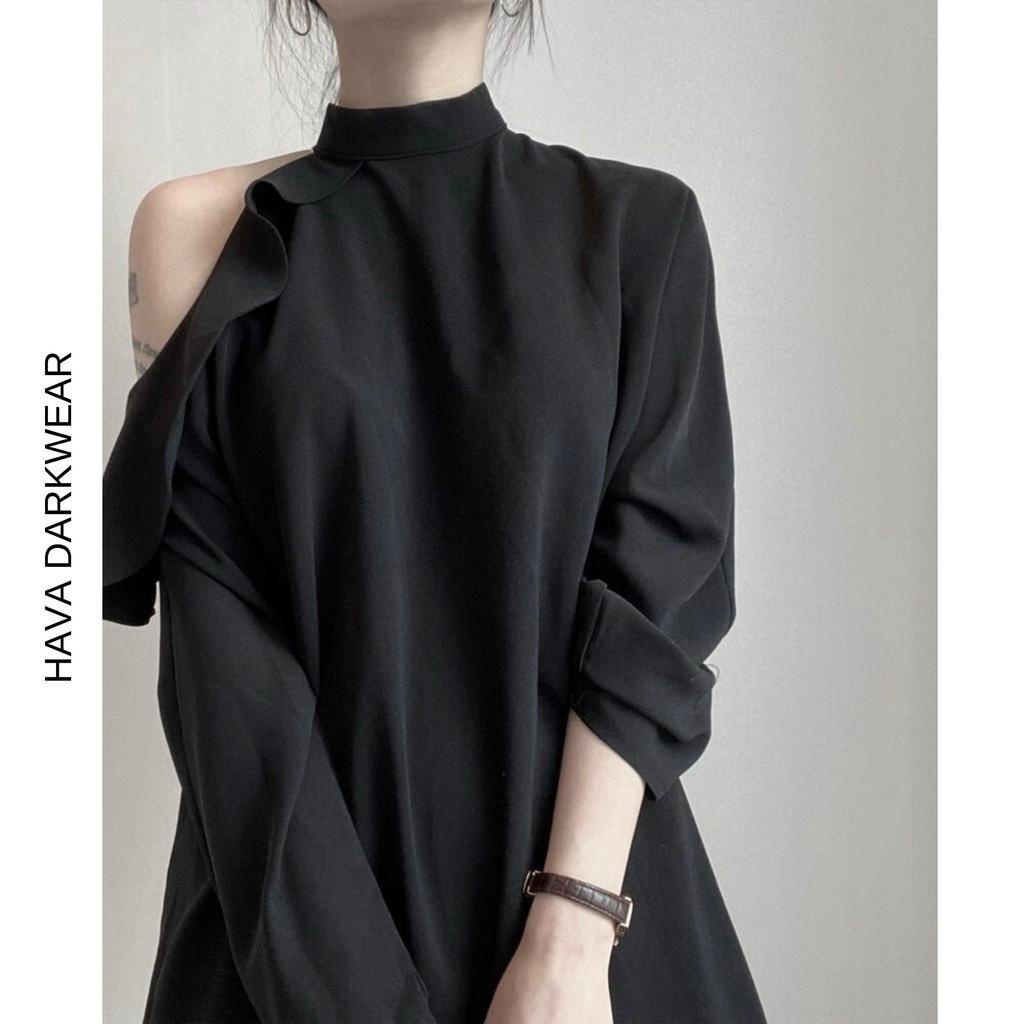 Áo HavaDarkwear cổ tàu màu đen khoét vai kèm dây form suông rộng chất trượt hàn mềm mát ASM61