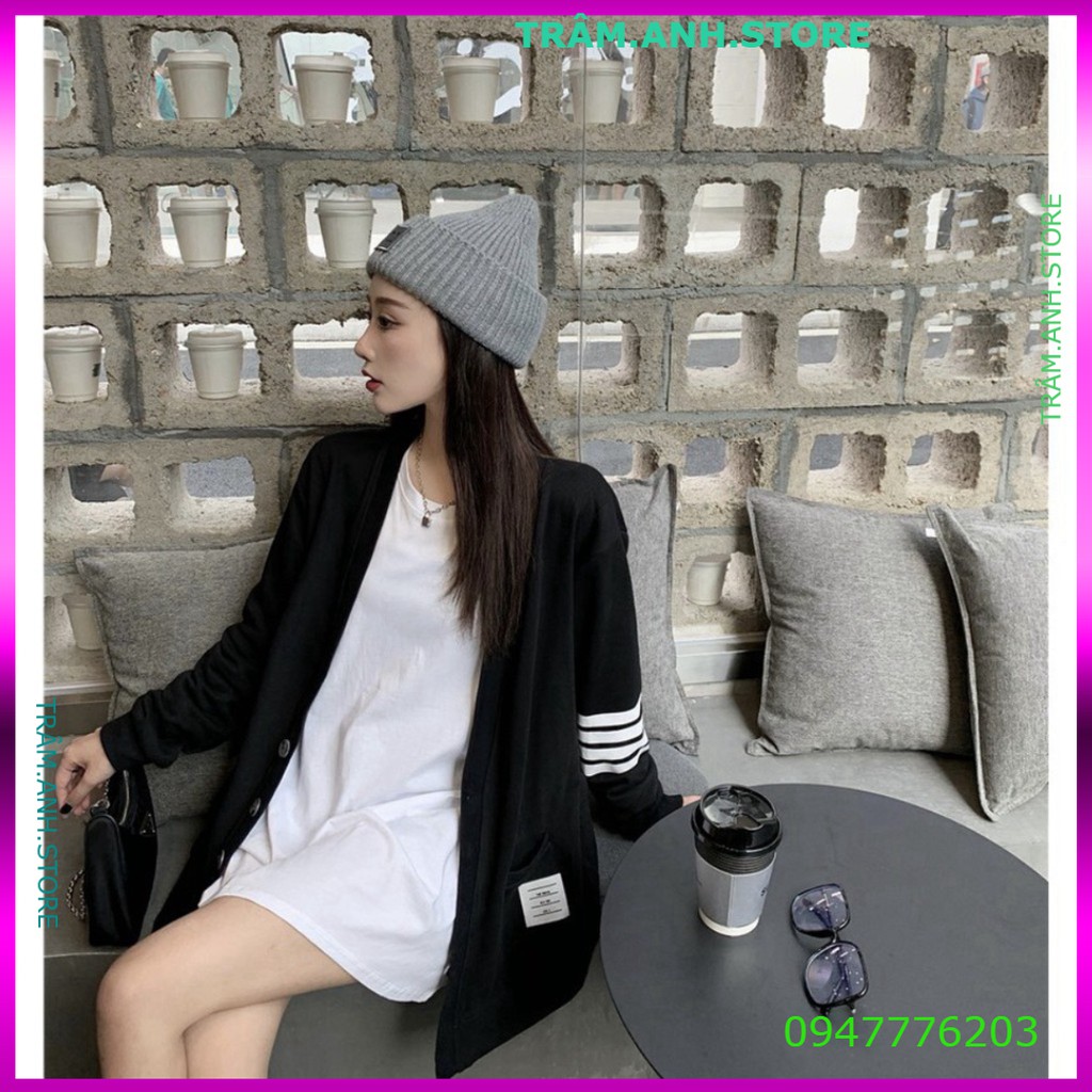 ÁO CADIGAN XÁM ĐEN SỌC NGANG CHO NỮ - ÁO KHOÁC LEN NỈ TAY DÀI CỔ CHỮ V KẺ VIỀN TRẮNG 👗 👑