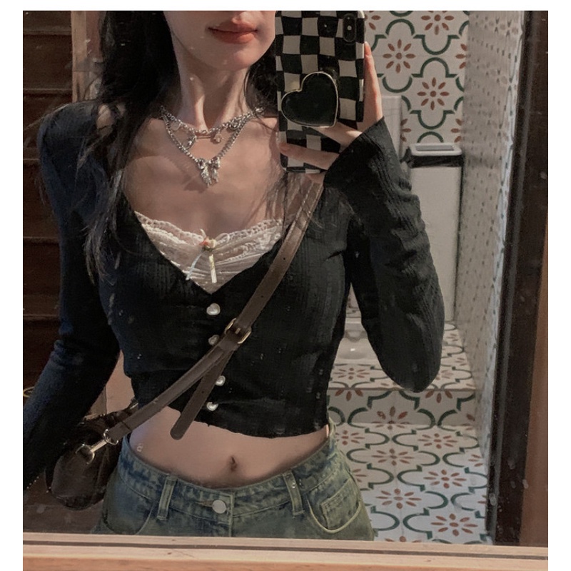 Áo Cardigan Dệt Kim Tay Dài Cổ Chữ V Phối Ren Hoa Thiết Kế Hợp Thời Trang
