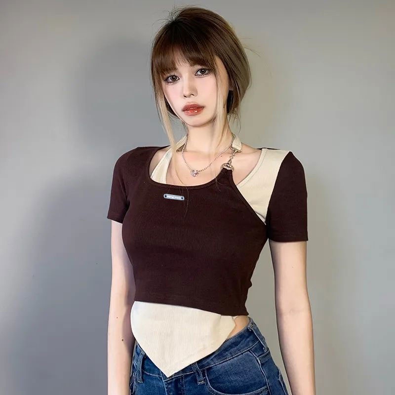 Áo crop top nữ thời trang với thiết kế không đều với dây chuyền JH-TX-39