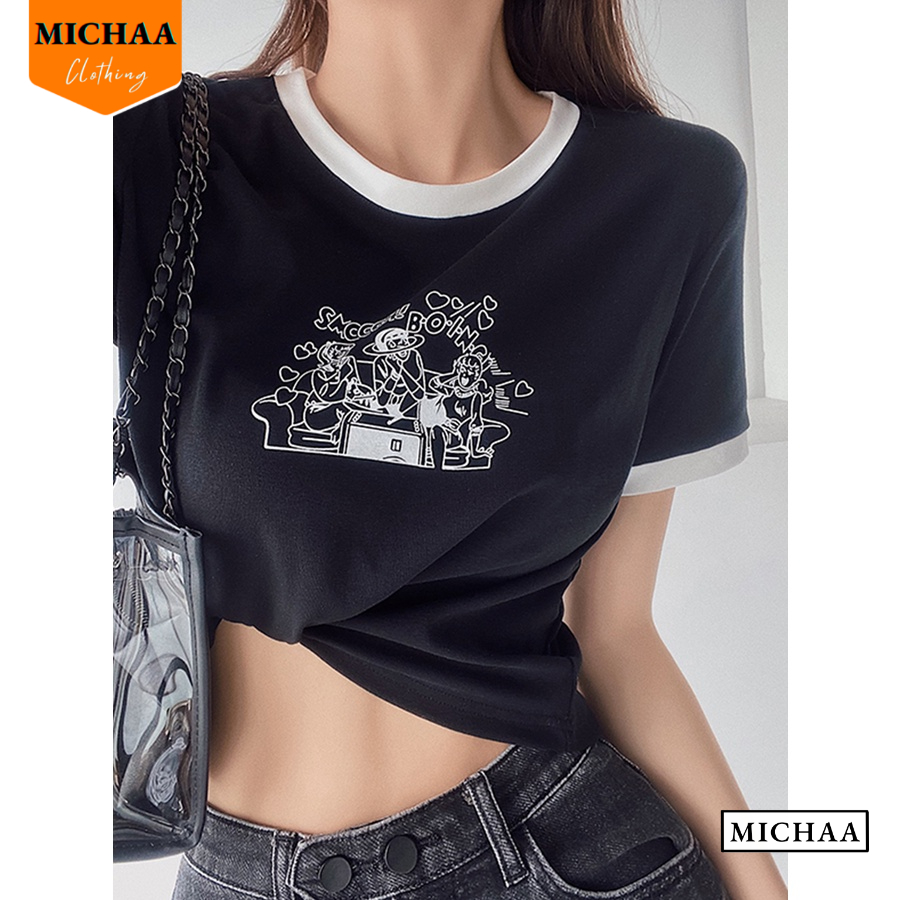 Áo Croptop Ôm Body Nữ SMOOCH TIM Cổ Tròn Tay Ngắn, Áo Thun Croptop Kiểu In Họa Tiết - MICHAA CR89