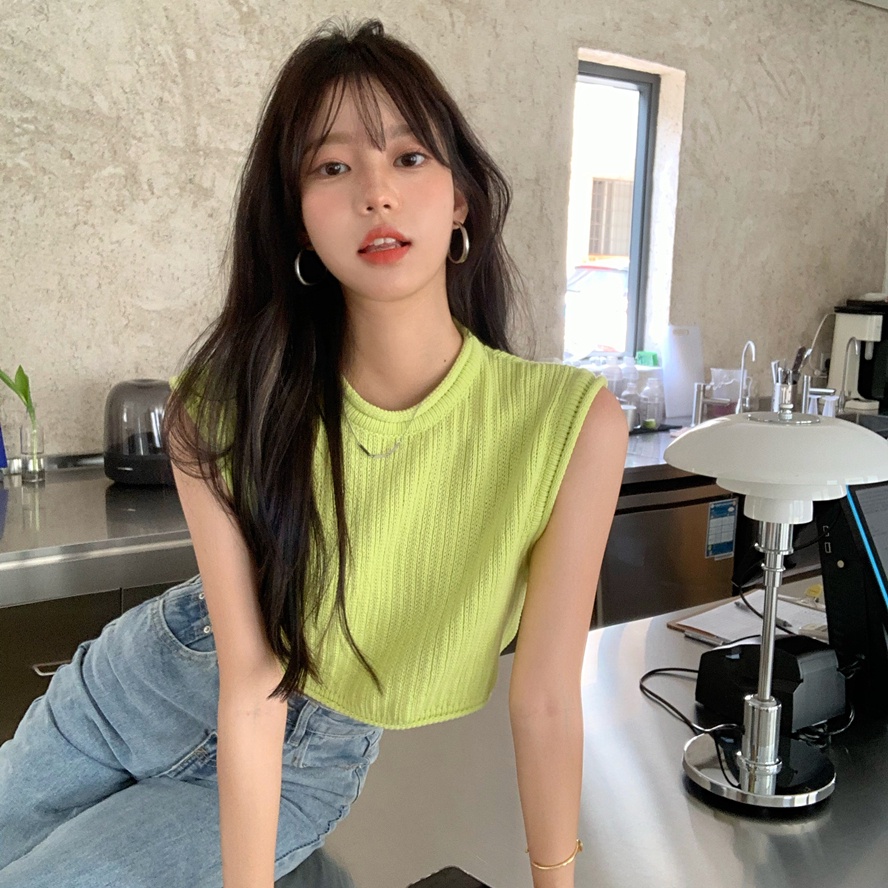 Áo Croptop Dệt Kim Không Tay Cổ Tròn Dáng Rộng Màu Xanh Lá Huỳnh Quang Thời Trang Mùa Hè Dành Cho Bạn Nữ