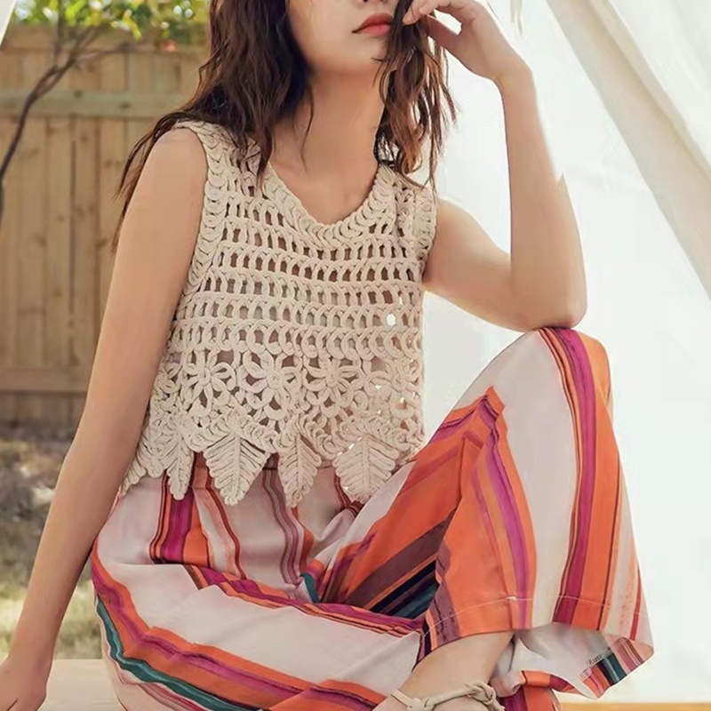 Áo Croptop Dệt Kim Không Tay In Họa Tiết Lá Rỗng Dành Cho Nữ