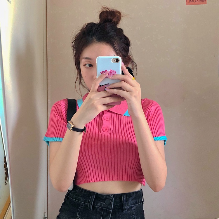 Áo croptop dệt kim tay ngắn cổ polo dễ phối đồ thời trang cho nữ