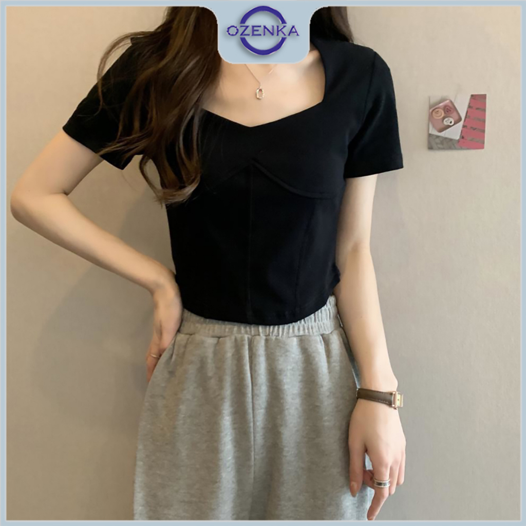 Áo croptop nữ ôm vạt bầu cổ vuông tay ngắn , áo crt thun cotton màu đen trắng sang trọng mặc đi học đi chơi Ozenka