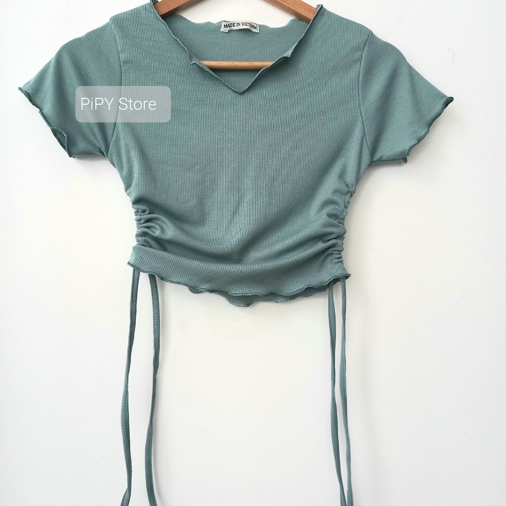 Áo Croptop nữ ngắn tay cổ v rút dây 2 bên, áo mặc hè nữ chất thun gân nhiều màu co giãn tốt L21