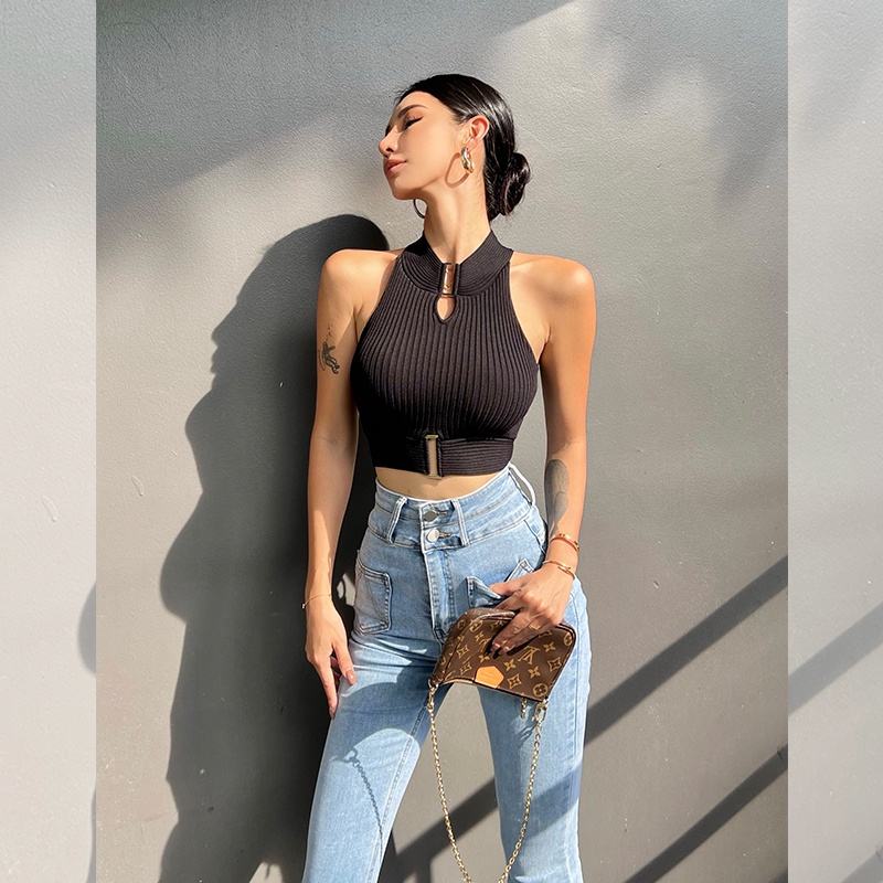 Áo croptop QKOOLE dệt kim không tay phong cách Hàn Quốc thiết kế quyến rũ cho nữ