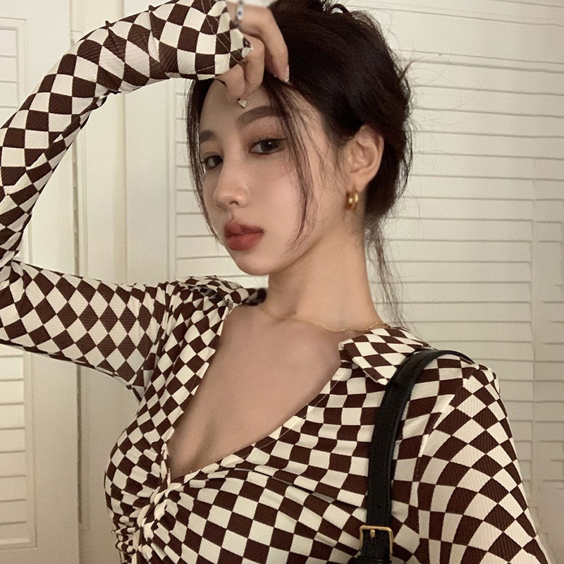 Áo Croptop Tay Dài Cổ Chữ V Họa Tiết Kẻ Sọc Thời Trang Hàn Quốc Cho Nữ