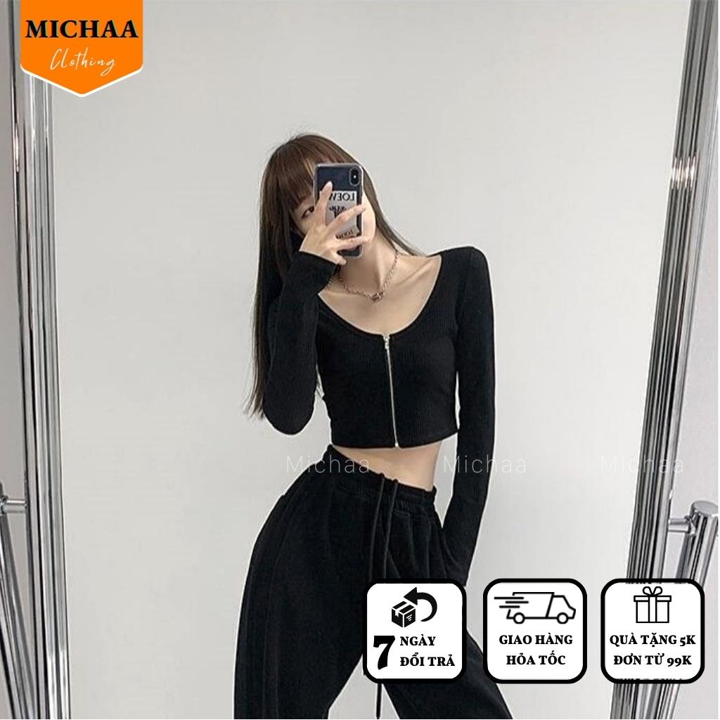 Áo Croptop Tay Dài DÂY KÉO NGỰC Nữ Thun Gân Ulzzang Kiểu Cổ Vuông Đẹp Ôm Body - MICHAA