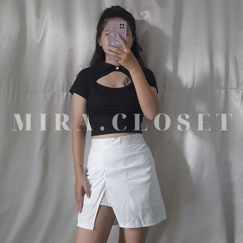Áo Croptop Tay Ngắn MIRA.CLOSET Cổ Bẻ Khoét Ngực Ôm Dáng A5149
