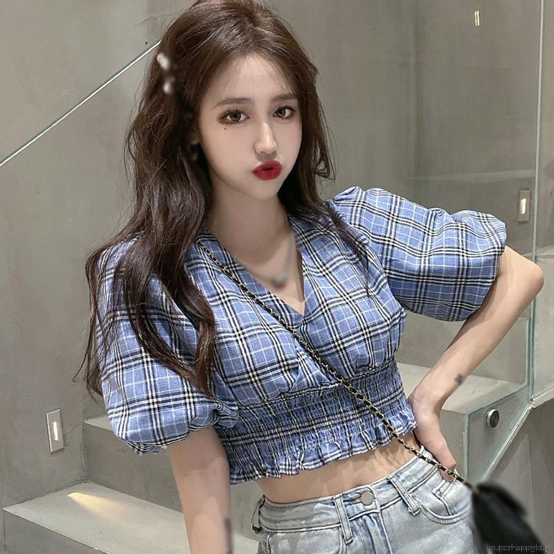 Áo croptop tay phồng cổ chữ V in caro thời trang cho nữ