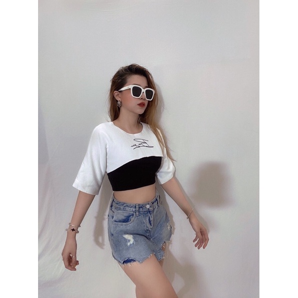 Áo croptop thun nỉ cánh dơi form rộng hở ngực in chữ đen, 2 màu
