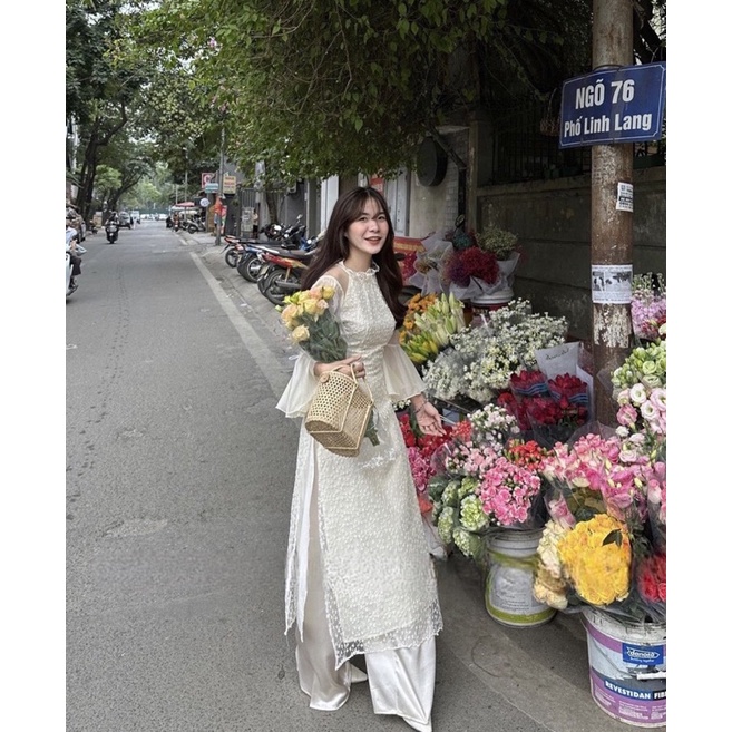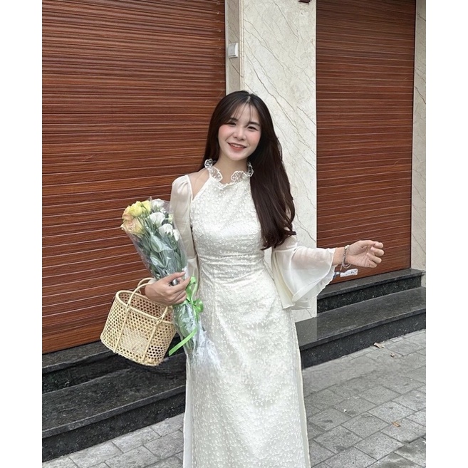 Áo dài cách tân chơi tết thiết kế cao cấp cổ yếm 4 tà tay loe sang trọng + quần ống suông phối ren hoa thêu