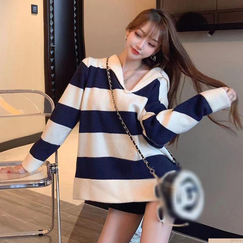 Áo dệt kim nữ tay dài cổ chữ V họa tiết sọc ngang thời trang