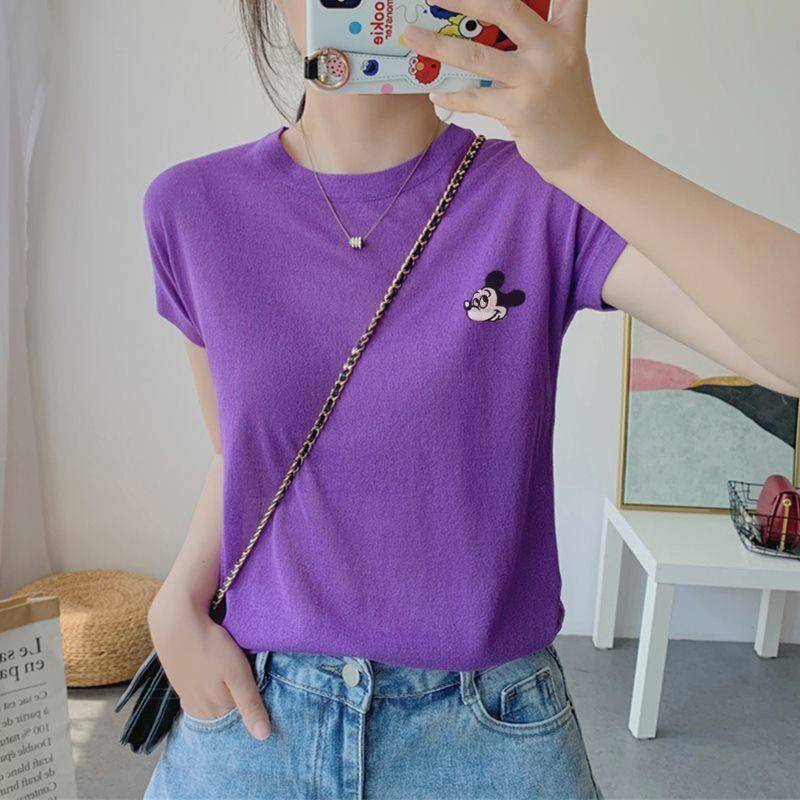 Áo Dệt Kim Tay Ngắn Cổ Tròn Dáng Rộng Thêu Hình Chuột Mickey Màu Sắc Đơn Giản Thời Trang Cho Nữ