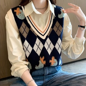 Áo dệt kim ZHELIHANGFEI không tay cổ V họa tiết hình thoi xinh xắn dễ phối đồ