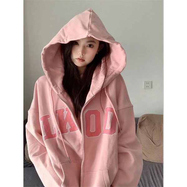 Áo Khoác Có Nón Khóa Kéo In Chữ Thời Trang Hàn Quốc