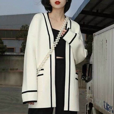 Áo khoác cadigan nỉ lót bông viền trắng đen mềm mại xinh xắn - Tuệ Nhiên