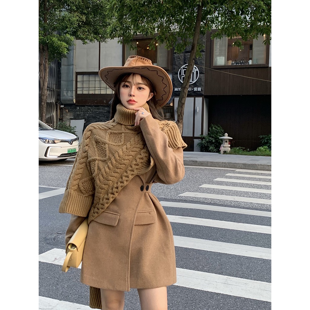 Áo khoác dạ mùa đông của nữ phối áo choàng len vặn thừng hàng Quảng Châu cao cấp đầu xu hướng 2021