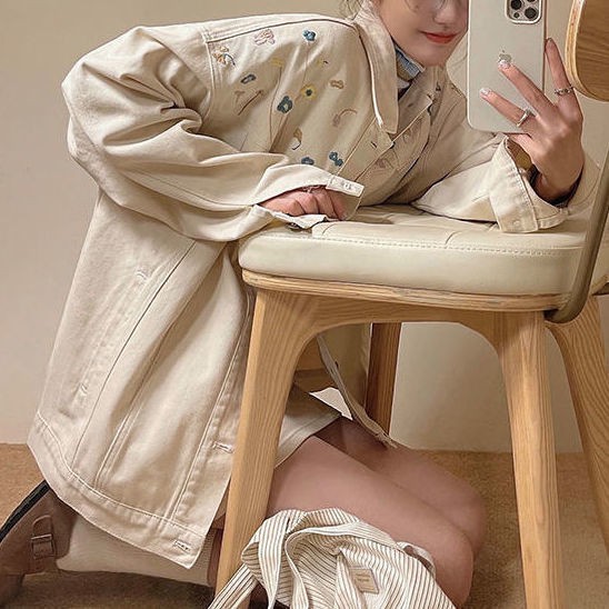 Áo Khoác Jean Dáng Rộng Cỡ Lớn Thêu Họa Tiết Phong Cách Retro Hàn Quốc Thời Trang Mùa Thu Cho Nữ