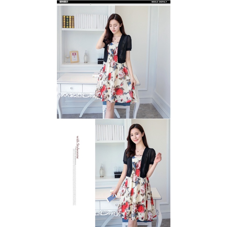 Sét đầm nữ hai dây chất voan họa tiết phối cùng áo khoác mỏng tay dài duyên dáng