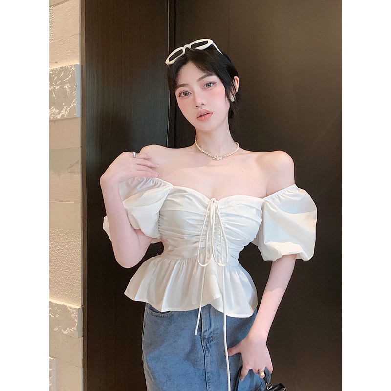 Áo Kiểu Cổ Vuông Tay Ngắn Phối Dây Rút Thời Trang Mùa Hè Dành Cho Nữ