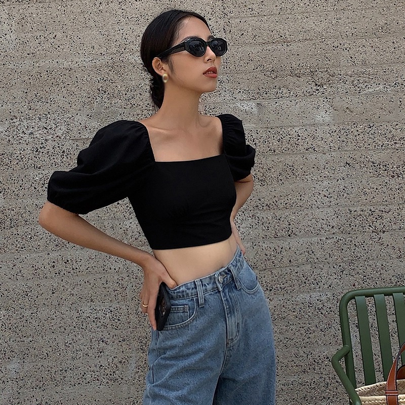 Áo kiểu cổ vuông tay ngắn phối ren hở rốn phong cách retro gợi cảm dành cho nữ