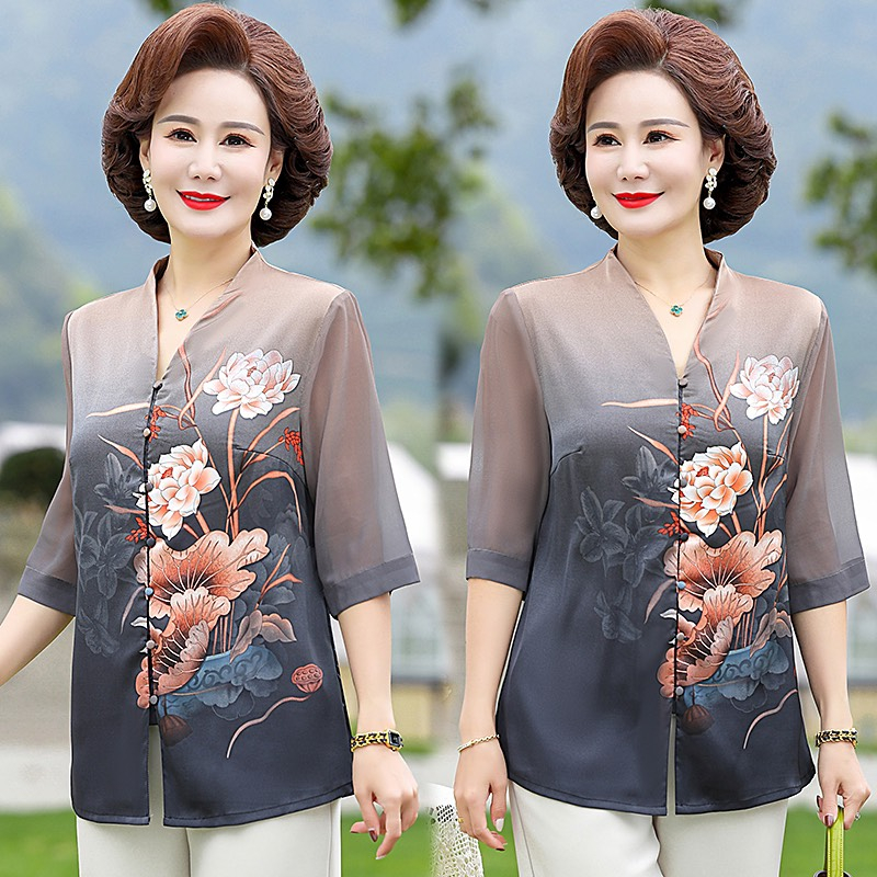 Áo Kiểu Nữ Trung Niên Chất Lụa Hoa Mềm Mát Hoạ Tiết Hoa Đính Đá Sang Trọng Free size 53-66kg