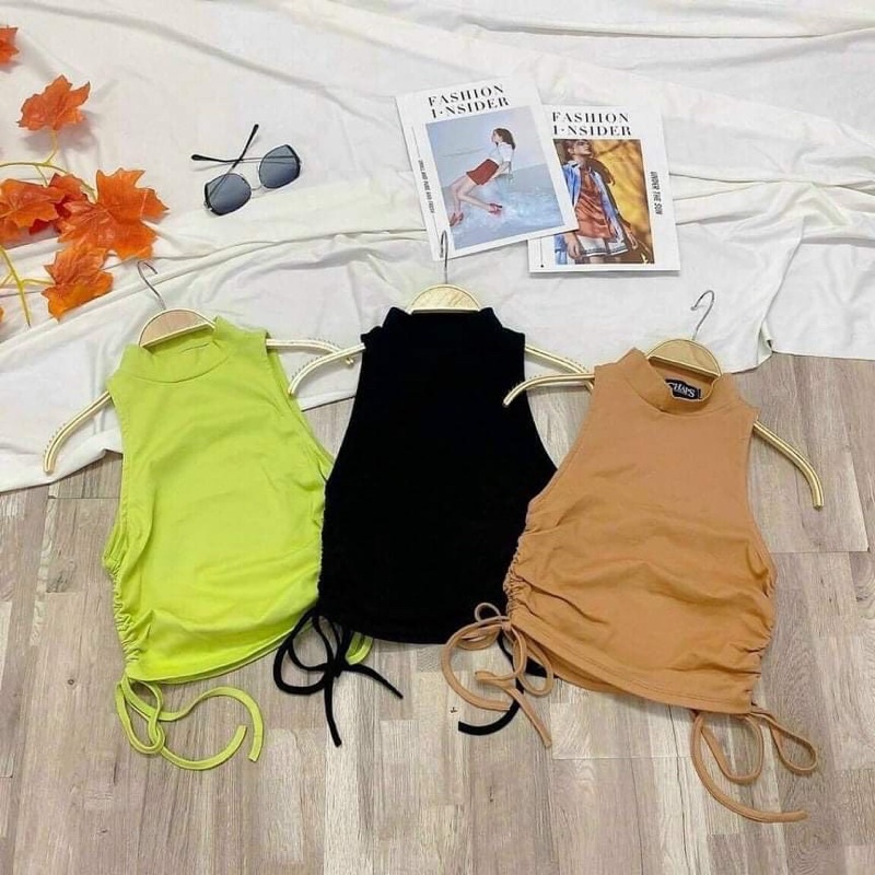 Áo kiểu nữ cổ lọ sát nách phối dây rút 2 bên, chất thun borip loại 1. Free size dưới 56kg