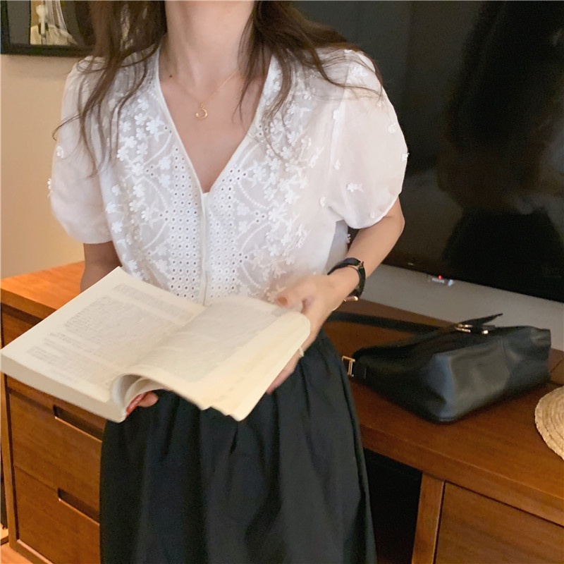 Áo kiểu Peppermint 44965 tay ngắn cổ V họa tiết thêu thanh lịch phong cách Hàn Quốc