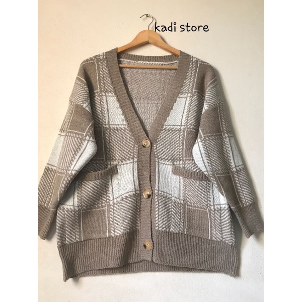 Áo len cardigan from rộng tay dài cổ V họa tiết caro