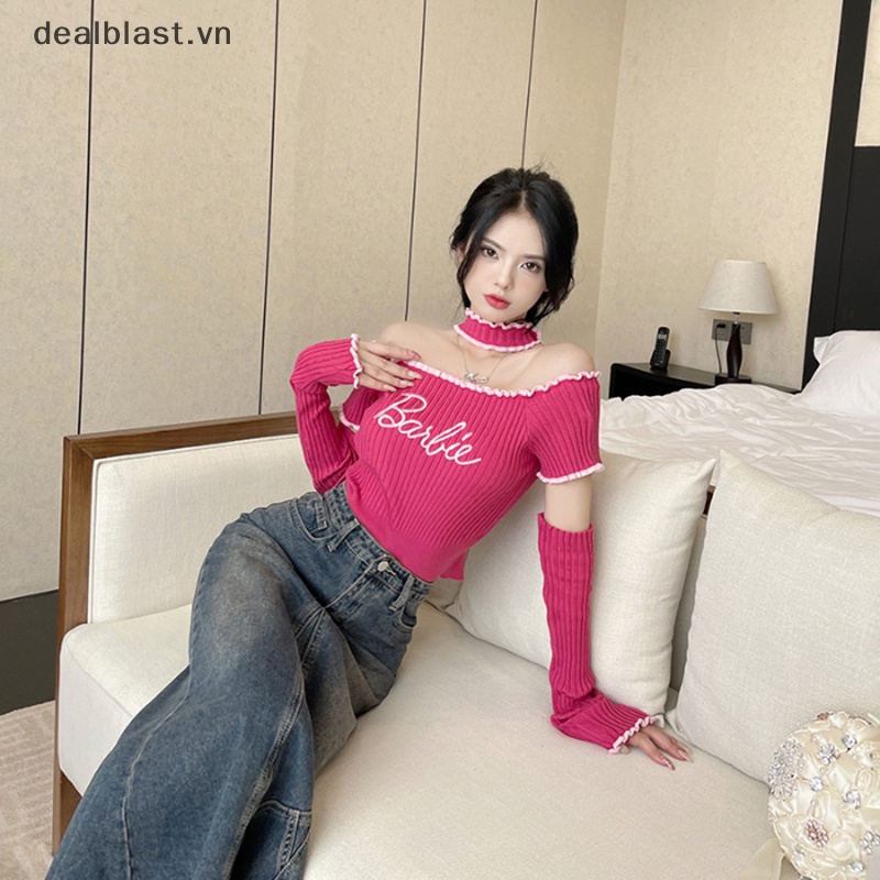 Áo Len Chui Đầu Trễ Vai In Chữ y2k Màu Hồng Cho Nữ