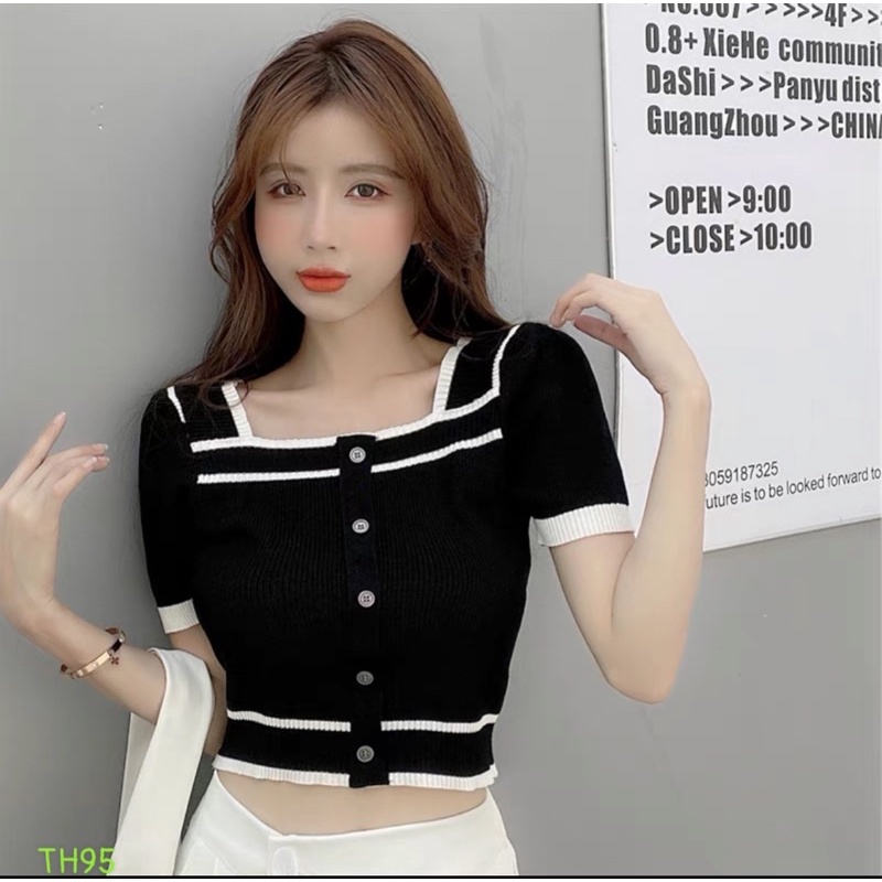ÁO LEN CROPTOP CỔ VUÔNG ngắn tay , áo len phối viền chất len quảng châu siêu mịn đẹp hai màu trắng đen