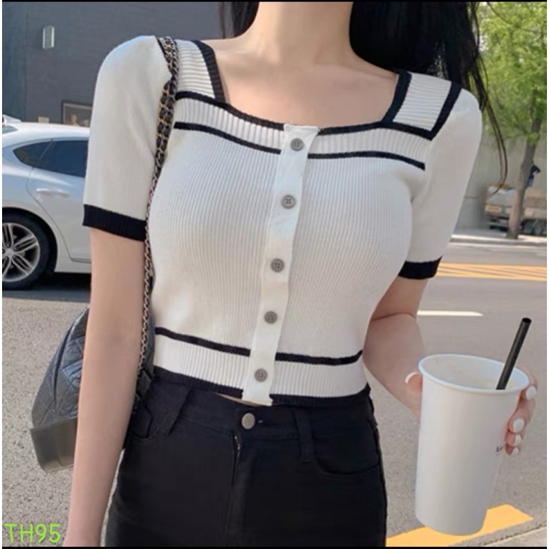 Áo len croptop dệt kim nữ kiểu cổ vuông tay ngắn phối màu thiết kế Quảng Châu trẻ trung cá tính