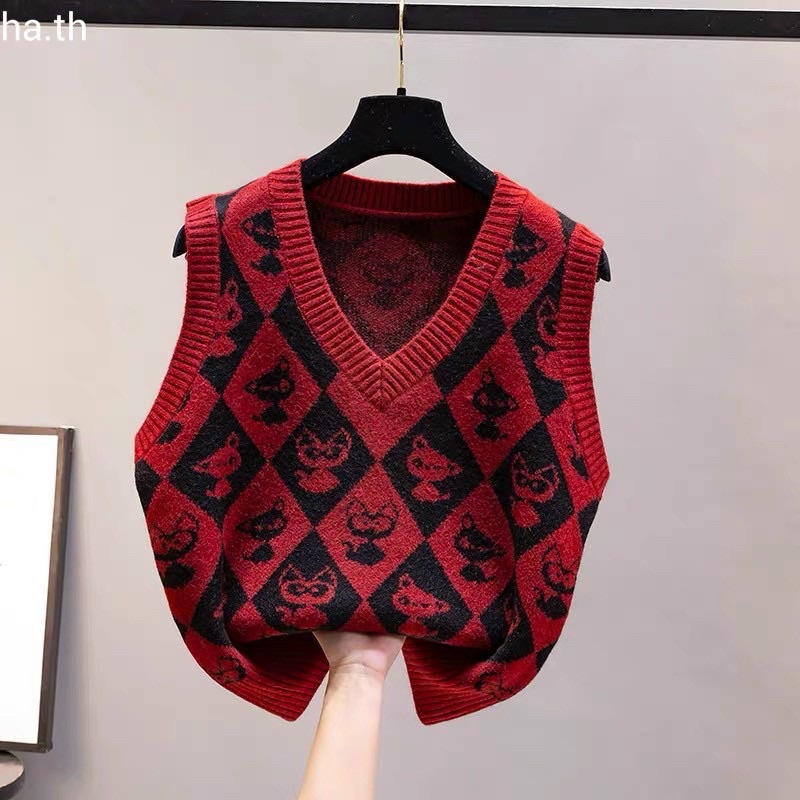 ÁO len nữ, áo gile họa tiết quả trám _Len ghi lê Áo Dệt Kim Không Tay Cổ Chữ V Phong Cách Retro Hàn Quốc