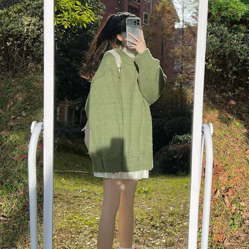 Áo len nữ kiểu nữ sinh Trung Hàn xinh xắn cổ tròn màu xanh bơ tone trầm trendy freesize dáng vừa