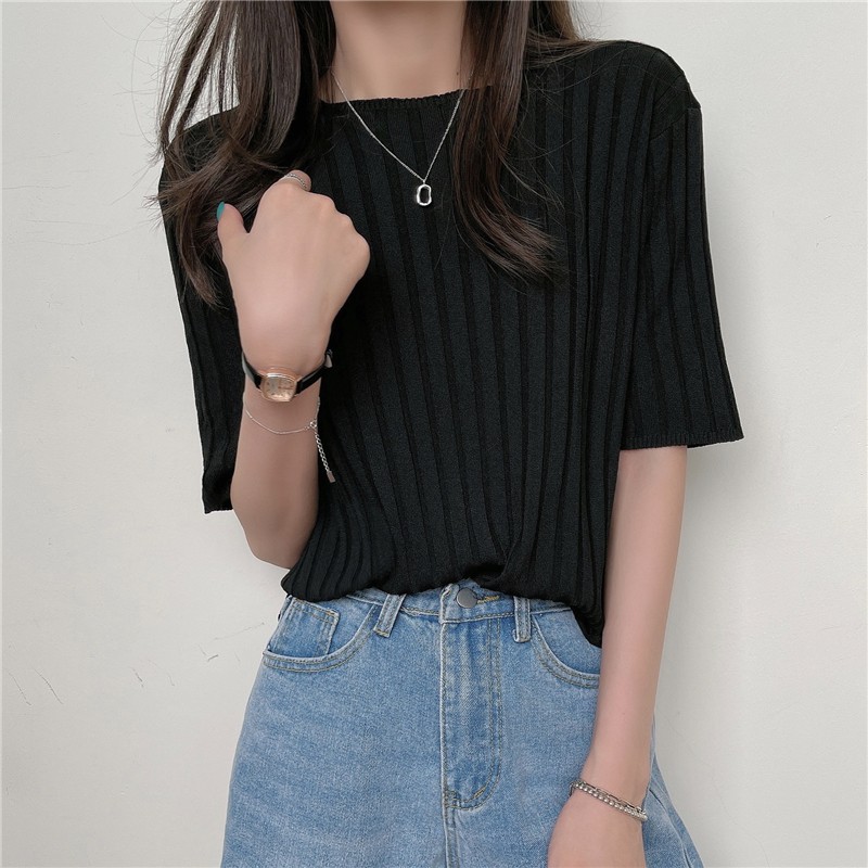 Áo len tay ngắn cổ tròn dáng ôm phong cách Hàn Quốc trẻ trung cho nữ
