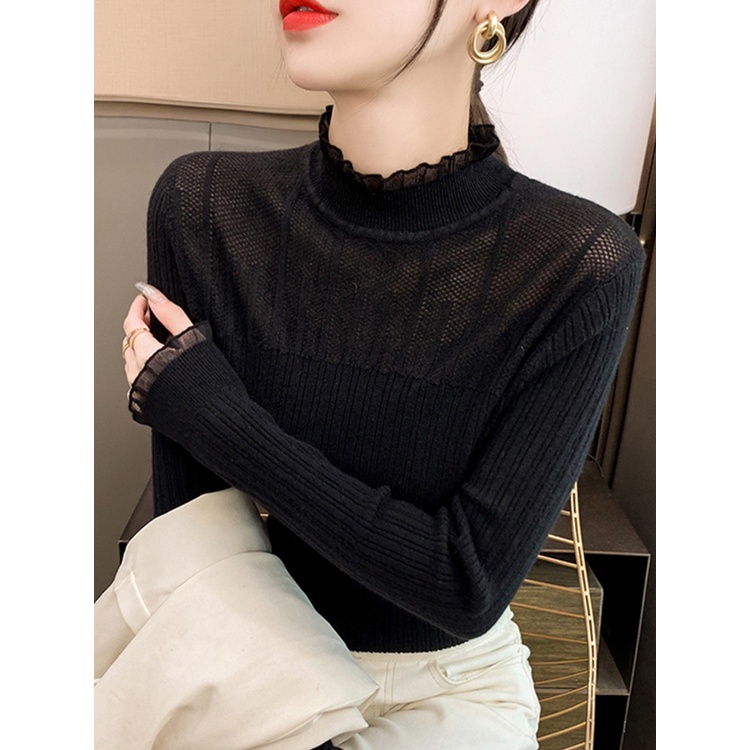 Áo nữ dệt kim ZHELIHANGFEI tay dài cổ cao phối ren quyến rũ thời trang