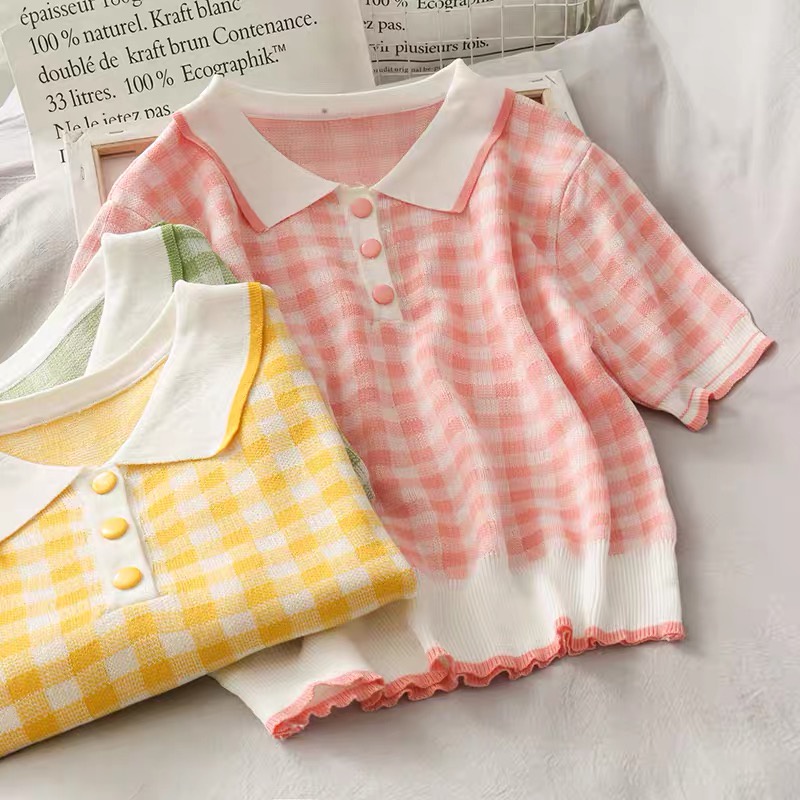 Áo caro croptop polo dệt kim nữ kiểu cổ đức tay ngắn phong cách Hàn Quốc trẻ trung cá tính