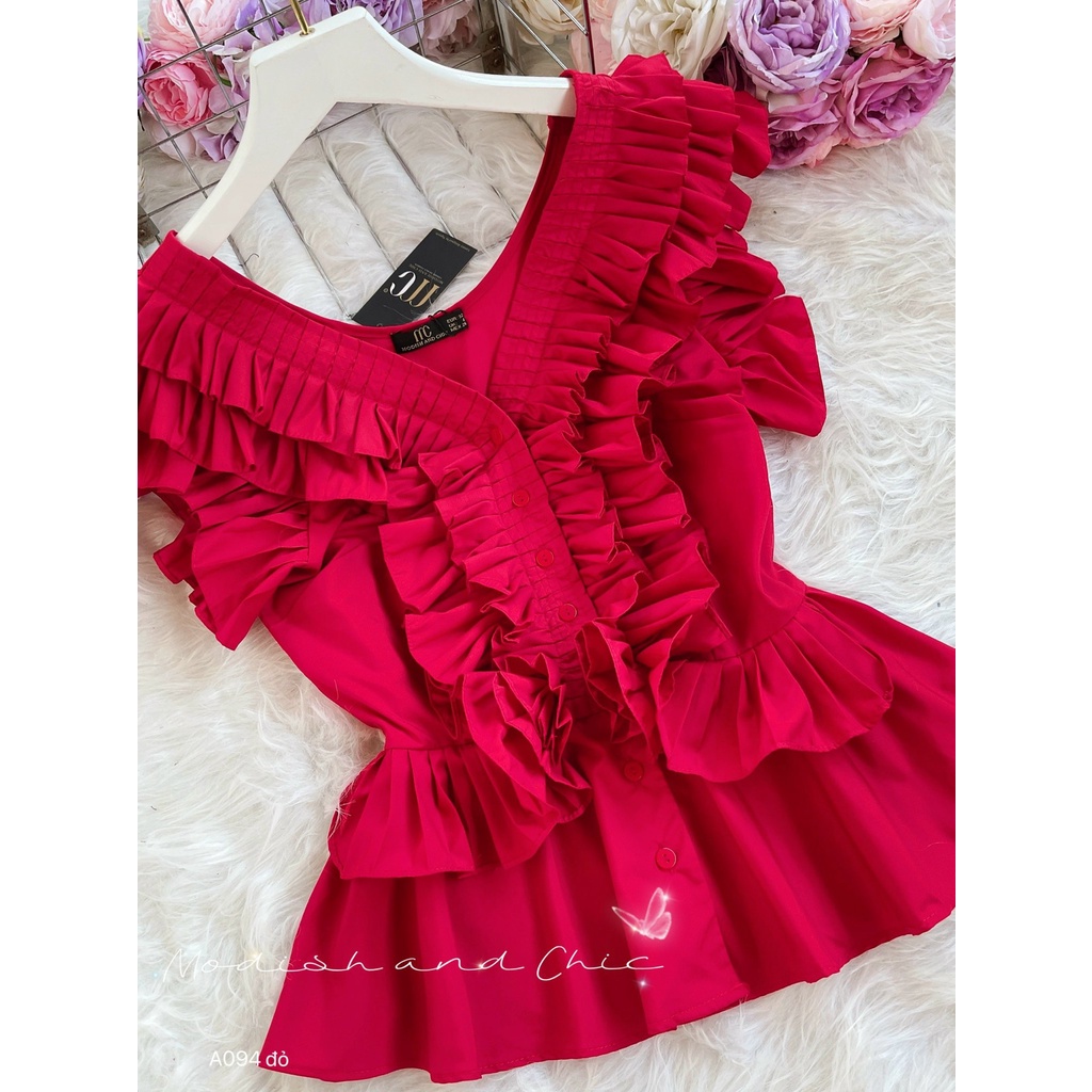 Áo sơ mi kiểu nữ đỏ cổ V bèo ngực A094 - Mimo Shop Thời trang thiết kế
