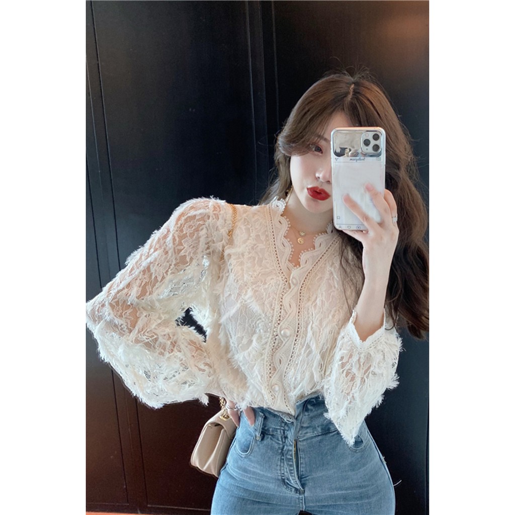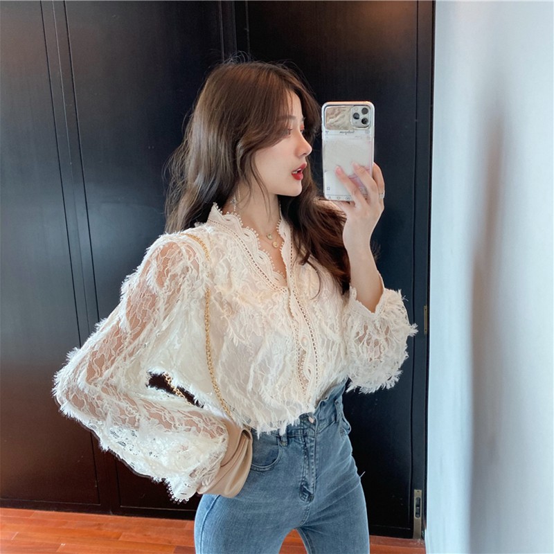Áo sơ mi nữ ren lông phối lưới đính khuy ngọc sang chảnh Hàn Quốc