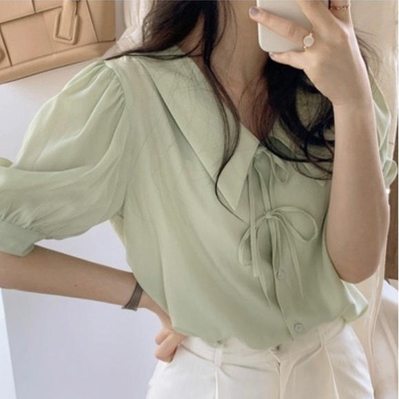 Áo sơ mi nữ tay phồng màu pastel cổ lạ thắt nơ xinh xắn tiểu thư phong cách Hàn Quốc 2022
