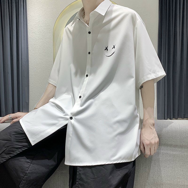 Áo sơ mi nam form rộng ngắn tay họa tiết mặt cười chất vải voan lụa mềm dày dặn chất lượng giá tốt