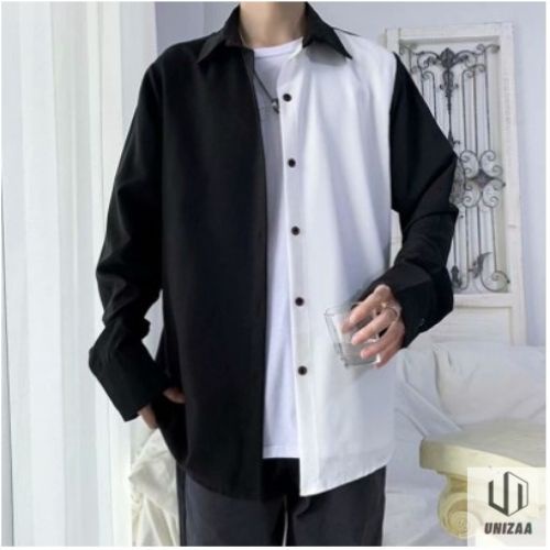 Áo sơ mi nam form rộng tay dài Unizaa kiểu unisex phối màu trắng đen khoác ngoài kẻ sọc nữ oversize hàn quốc AS02