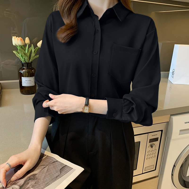 Áo sơ mi tay dài form rộng màu trơn phong cách Hàn Quốc thanh lịch trẻ trung cho nữ