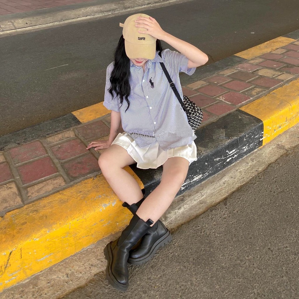 Áo sơmi cộc tay cúc lưng tay gập / Áo sơ mi kẻ sọc nhỏ tay lỡ siêu xinh