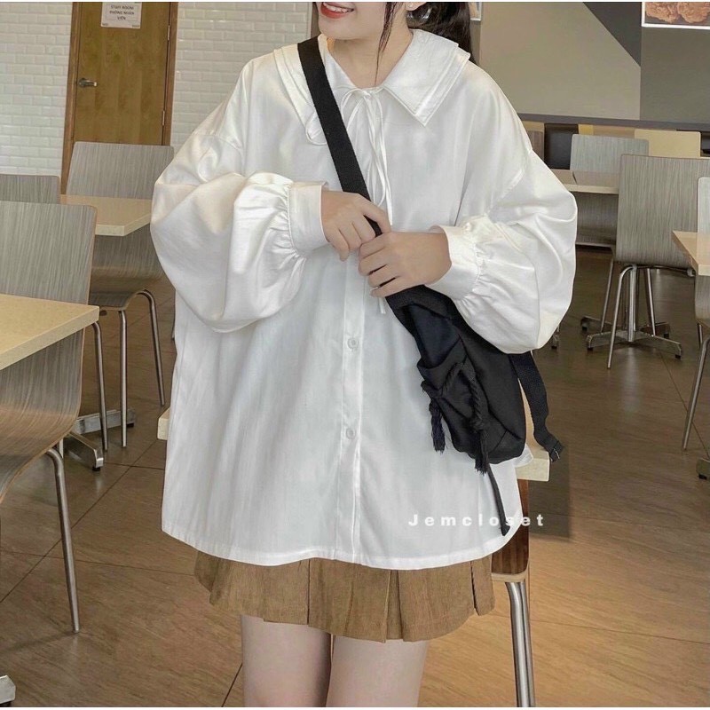 Áo sơ mi trắng cổ PETET buộc nơ tay bồng thanh lịch/ Áo sơ mi nữ form rộng unisex_xuongmaythuhien